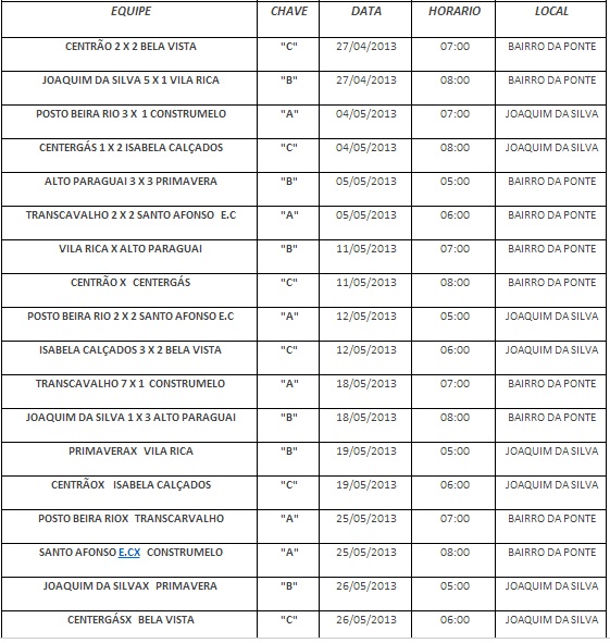 Dois jogos movimentam os sábados à partir das 19h, e no domingo à partir das 17h 30, também com dois jogos. No próximo final de semana serão realizados os jogos válidos pela 5ª rodada do campeonato. A final está prevista para ser realizada no mês de junho.