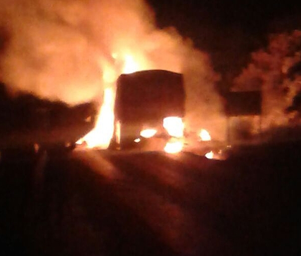 Uma carreta que levava algumas toneladas de milho pegou fogo, ontem à noite, na BR-163, nas proximidades do Posto Gil. Ela ficou completamente destruída, bem como a carga. O motorista escapou ileso.