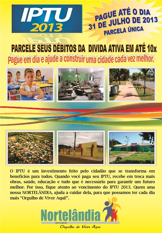 A Prefeitura Municipal de Nortelândia fez nesta segunda-feira (13.05) o lançamento do Imposto Predial e Territorial Urbano (IPTU) para 2013. Os contribuintes poderão pagar o IPTU de 2013 à vista, com vencimento em 31 de julho. Neste ano, foram gerados cerca de 2.800 boletos, com a expectativa do Setor de Tributação de arrecadar um valor aproximado de R$ 100.000,00.