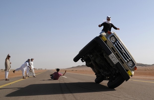 Na Arábia Saudita, entre os jovens há um costume perigoso conhecido como “esqui lateral” (em tradução livre), que consiste em trafegar o maior tempo possível com as duas rodas do veículo. Visto como uma espécie de hobby no país, algumas pessoas se arriscam ainda mais e chegam a ficar no caminho do veículo em movimento, logo abaixo das rodas suspensas.