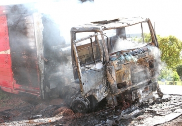 Um caminhão, pertencente a uma distribuidora de refrigerantes, ficou com a cabine completamente destruída, nesta tarde, após incêndio. O veículo seguia na BR-163, sentido bairro Camping Clube, quando em frente a uma fazenda, onde funciona um centro de pesquisas, as chamas iniciaram.