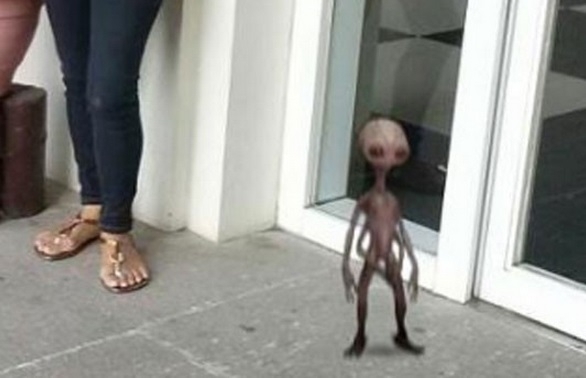 A funcionária identificada como Emily Santodelsis contou que pediu para seu colega de trabalho Arian Ponce tirar uma foto dela com o celular, mas, quando olhou a imagem depois, ela viu uma criatura de aparência estranha que parecia um alienígena em pé ao lado dela.