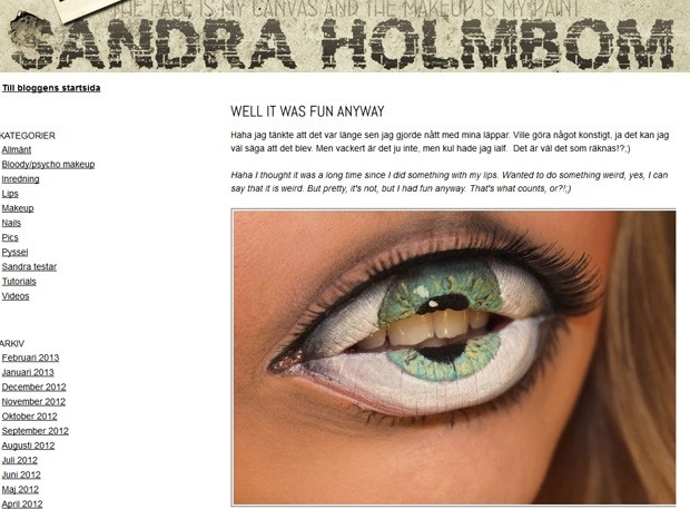 A maquiadora sueca Sandra Holmbom, conhecida também como “psycosandra”, é especializada em trabalhos que envolvem ilusões de ótica, e apresentou recentemente uma maquiagem que lembra um olho, só que feita na boca de uma modelo.