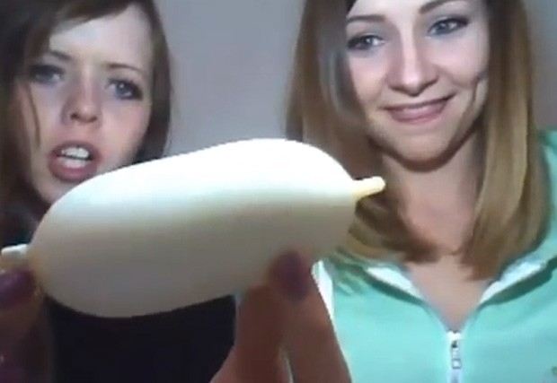 Na gravação, a garota corta a ponta da “camisinha” com uma tesoura, mas o sorvete se espalha e acaba derramado até no computador da jovem, que experimenta a sobremesa curiosa ao lado da amiga Mira.