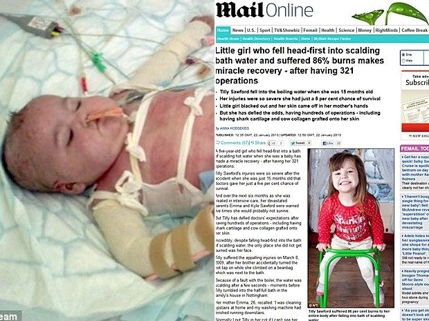 Aos 15 meses de idade, a inglesinha Tilly Sawford sofreu queimaduras em 86% de seu corpo após cair acidentalmente em uma banheira com água fervente.