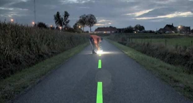 Uma das companhias usa uma tinta sensível à luz para ser usada na sinalização de solo, que acumula energia como uma bateria e faz as faixas brilharem no escuro.