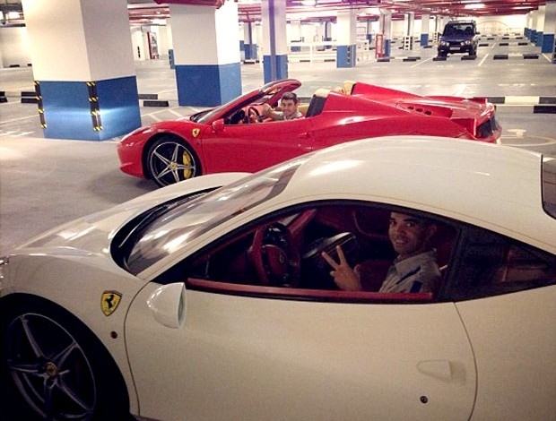 Alex e Diego Tardelli registraram o momento antes de saírem para o treino do Al Gharafa, do Catar. Os dois exibiram suas Ferraris. O meia preferiu uma na cor vermelha e ainda com a capota aberta. Já o atacante escolheu ir com sua máquina branca fechada. Com automóveis assim, eles certamente chegaram no horário dos trabalhos no clube, que rescindiu com o técnico Silas na tarde desta quarta.