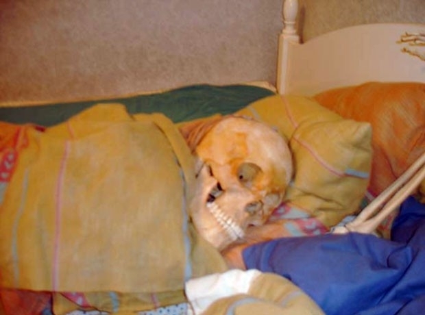 Polícia também achou fotos da mulher em que ela aparece envolvida em atividades sexuais com o esqueleto. (Foto: AFP)