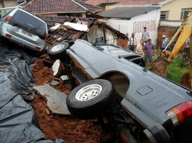 A chuva provocou estragos e trouxe prejuízo aos moradores na sexta-feira (9), em Getulina, SP. Por conta da força da água, um muro que separava duas casas na rua Barão do Rio Branco desabou e, sem a estrutura, o terreno cedeu. Dois carros que estavam estacionados no local caíram no barranco de lama.