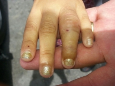 Criança teve um dedo da mão quebrado e hematomas pelo rosto