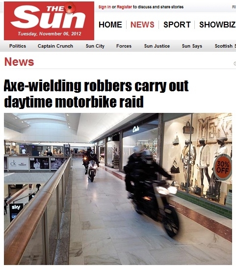 Seis membros de uma quadrilha entraram de moto em um shopping no norte de Londres (Inglaterra) em plena luz do dia e assaltaram uma joalheria.