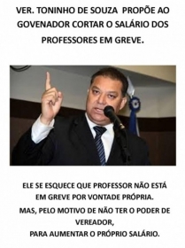 “Ver. Toninho de Souza propõe ao Govenador (sic) cortar o salário dos professores em greve. Ele se esquece que o professor não está em greve por vontade própria. Mas, pelo motivo de não ter o poder de vereador, para aumentar o próprio salário”, dizia a postagem, montada com a foto do parlamentar.