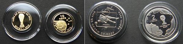 As duas moedas de prata têm valor de face de R$ 5 e peso de 27 gramas e custam para o colecionador R$ 190. Ambas fazem alusão à Copa do Mundo, de um lado, mas, no verso, enquanto uma apresenta o mascote oficial, com desenho do tatu estilizado, a outra traz um mapa do Brasil com indicação das 12 cidades-sede da competição.