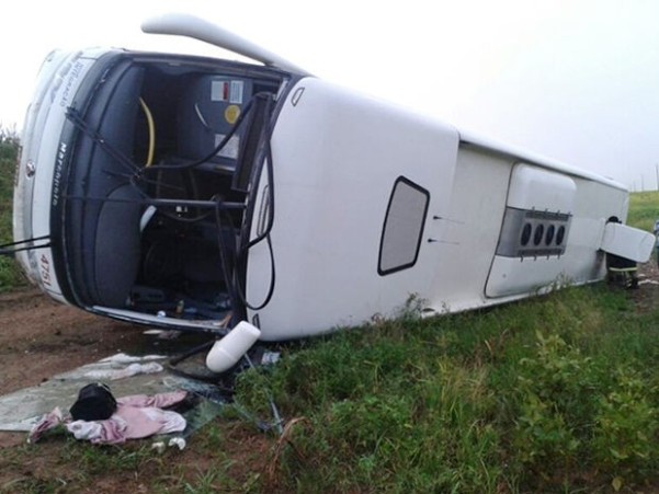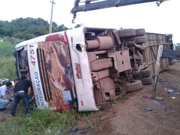 Conforme a PRF, os passageiros do veículo coletivo disseram que o ônibus saiu da pista depois de ser “fechado” por uma carreta bitrem e virou na lateral da rodovia.