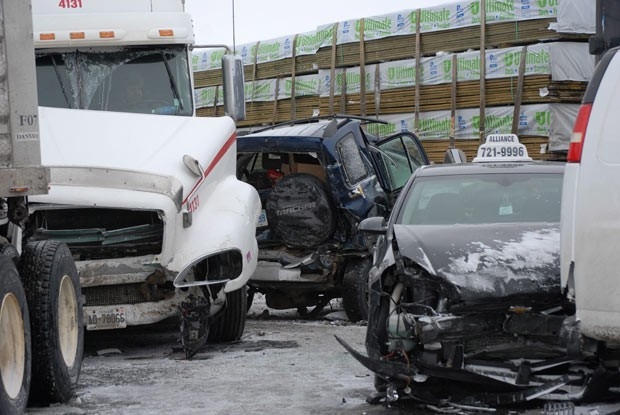 Pelo menos 96 veículos se envolveram em um engavetamento na manhã desta quinta-feira (27) em uma rodovia próximo a Innisfil, em Ontário, no Canadá.