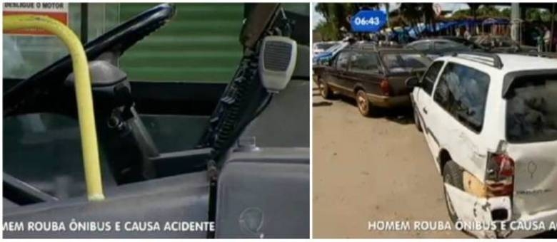 Um homem com problemas mentais aproveitou que a chave de um ônibus estava na ignição e saiu com o veículo da rodoviária em Trindade, Goiás. Desgovernado, o coletivo bateu em três carros e uma moto. Ninguém ficou ferido.