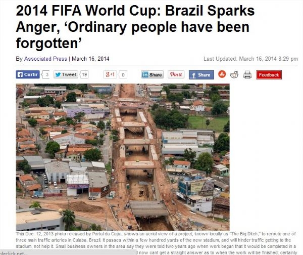 A agência de notícias Associated Press (AP) publicou uma extensa reportagem criticando as obras que estão sendo feitas com vistas a Copa do Mundo de 2014, em Cuiabá. A matéria diz que várias promessas não foram cumpridas e quem sofre com descaso é a população. A reportagem destacou também os atrasos das obras que tornariam a cidade uma nova metrópole. Entre elas citou as principais construções de mobilidade urbana, o Veículo Leve sobre Trilhos (VLT) e o Aeroporto Marechal Rondon.