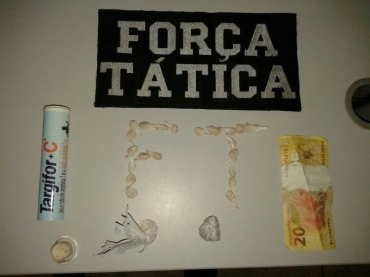 Apos abordagem e as buscas pessoais a Polícia da Força Tática conseguiu localizar com o menor infrator 21 papelotes de substancia análoga de pasta base à cocaína, dentro de uma embalagem de medicamento enrolado numa sacola.