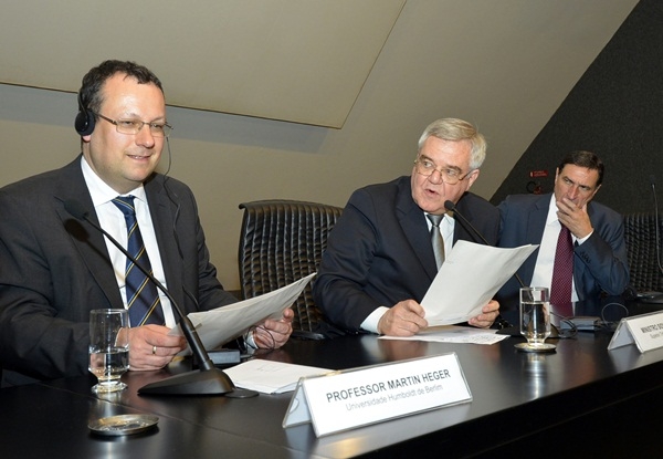 Durante a apresentação, a mesa foi composta pelo palestrante, pelos ministros Sidnei Beneti e Moura Ribeiro, ambos do STJ, pelo desembargador federal Carlos Fernando Mathias de Souza, pelo desembargador do Tribunal de Justiça de São Paulo Celso Limongi e pela professora Anneke Petzsche, da Universidade Humboldt de Berlim.