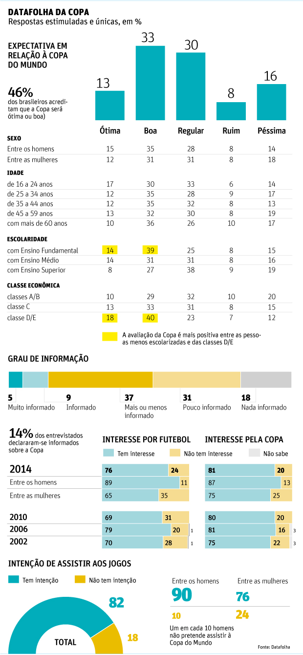 Outro dado da pesquisa mostra que o fato de a Copa do Mundo ser realizada no Brasil não aumentou o interesse do brasileiro pela competição. Segundo o Datafolha, 81% dos entrevistados se interessam pela competição.