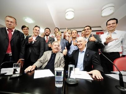 Lula posa para fotos ao lado do presidente nacional do PT, Rui Falcão, e candidatos do partido que vão ao 2º turno