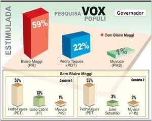 No cenário em que Blairo Maggi está na disputa, o senador republicano possui 59% das intenções de votos, contra 22% de Pedro Taques. O jornalista José Marcondes, o Muvuca (PHS), aparece com apenas 1%. Do total de entrevistados, 6% afirmaram que anularão o voto ou votarão em branco e 12% não disseram em quem vão votar.