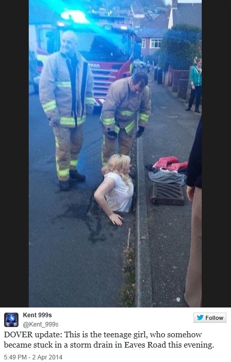 Uma jovem de 16 anos ficou entalada em um bueiro em rua de Dover (Inglaterra) ao tentar recuperar o seu iPhone 5 que havia caído no local no início da noite na quarta-feira (2/4). Uma equipe de resgate do Kent 999 foi chamada ao local e retirou a jovem com segurança após 15 minutos. O aparelho foi perdido.