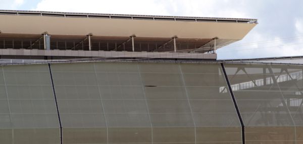 As obras nemchegaram ao fim na Arena Pantanal de Cuiabá, e a tela de proteção do estádio apresenta defeito. Um rasgo no setor Sul da Arena, pode ser visto de longe na membrana verde que encobre o estádio que receberá 4 jogos da Copa do Mundo este ano.
