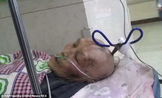 A idosa foi levada para um hospital local, onde os médicos correram para removerem o instrumento por meio de cirurgia. Depois de algumas horas, ela saiu da operação com a ferramenta, não mais presa em sua cabeça.