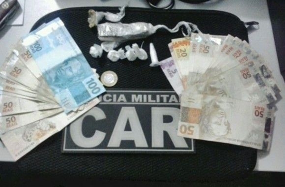 Durante a abordagem foram encontradas no baú da motocicleta um pino contendo duas trouxas de pasta base de cocaína, quatro invólucros de pasta base de cocaína e um tablete de maconha, além de uma quantia de R$ 1.036.