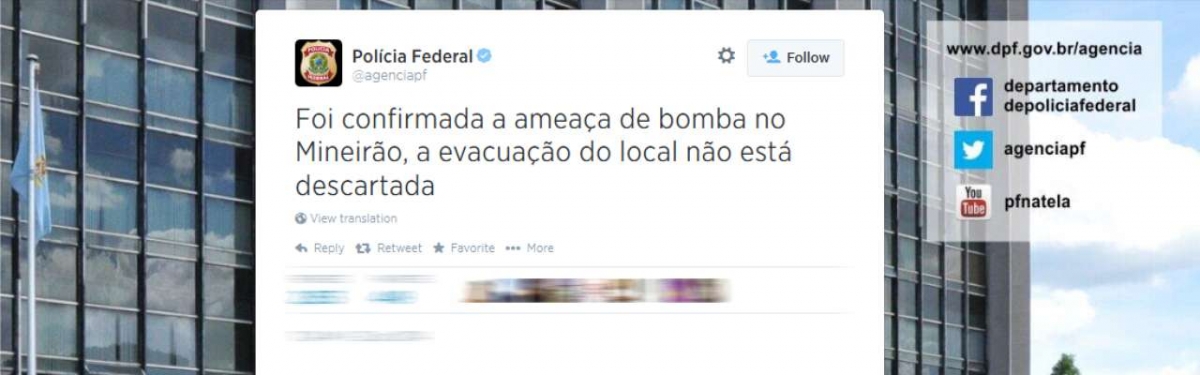 “A conta do Twitter da Polícia Federal foi invadida. A informação sobre ameaça de bomba no Mineirão é falsa”, anunciou. A mensagem na conta da PF foi posteriormente apagada.