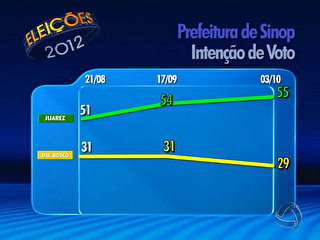 Em relação à pesquisa anterior, Juarez Costa (PMDB) passou de 54% para 55% e Dilceu Dal Bosco (DEM) tinha 31% e agora tem 29%.