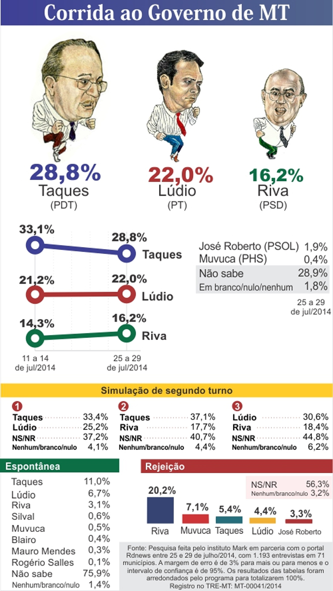 Na amostragem realizada no período de 11 a 14 deste mês, a primeira no Estado após as convenções, Taques estava com 33,1%. Agora figura com 28,8%.