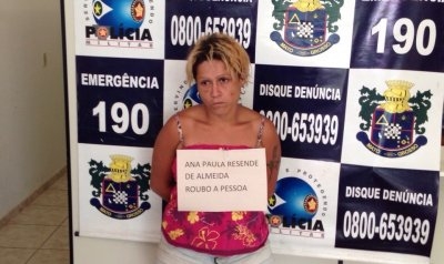 Ana Paula Resende de Almeida foi presa em flagrante ontem (8) pela Polícia Militar de Barra do Bugres por roubo a pessoa. A ocorrência foi registrada no Bairro Maracanã, nas proximidades do Forinho. A acusada roubou a bolsa contendo dinheiro, documentos pessoais e cartão bancário de uma idosa de 66 anos. A vítima levou um chute na perna e foi ameaçada com uma faca caso não entrasse a bolsa.