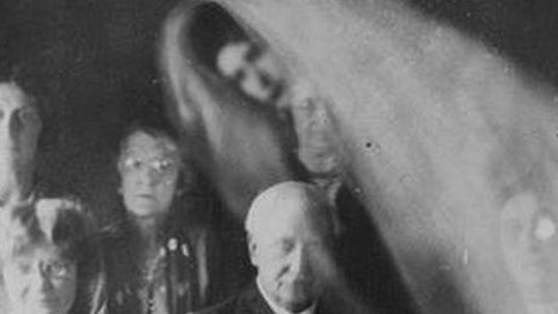 Quatro fotos tiradas durante uma sessão espírita na década de 1930 foram liberadas recentemente, e chamam a atenção por mostrar uma aparição fantasmagórica pairando acima dos membros nas imagens.