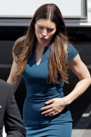 Apesar de ainda não ter confirmado oficialmente a gravidez, Jessica Biel apareceu com uma barriguinha em fotos tiradas no set de gravação de "New Girl" em agosto deste ano. Na imagem, a atriz e mulher de Justin Timberlake estava um pouco mais cheinha usando um vestido justo e com mão posicionada na barriga.