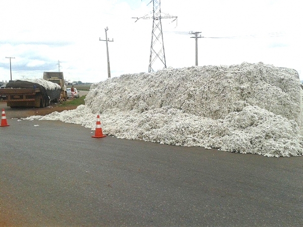 Uma carga de algodão se desprendeu da carreta e caiu rente ao trevo da BR-163 no entroncamento com a MT-249, na entrada da cidade, por volta das 11h. A Volvo, placas de Cuiabá, sau de Campo Novo dos Parecis e descarregaria em armazém em Nova Mutum. Na entrada da cidade, ao passar pelo trevo a carga se desprendeu.