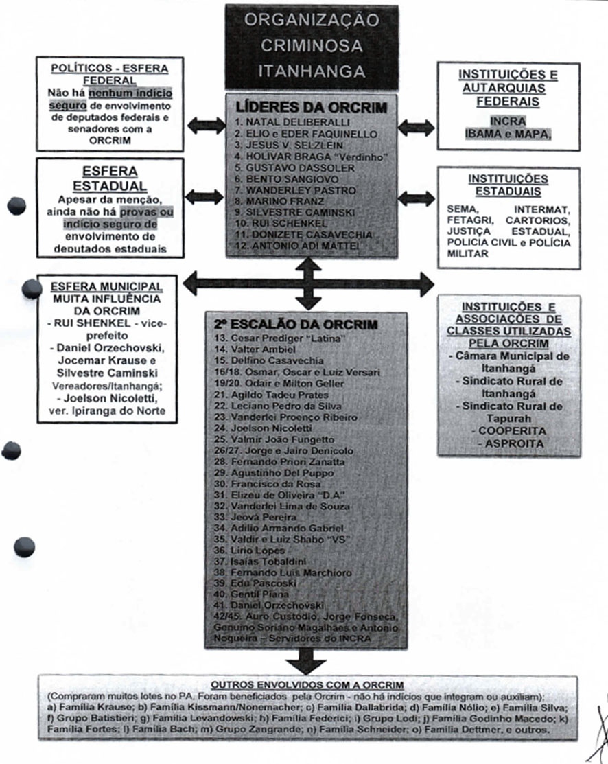 "O esquema tem a subordinação a alguma forma de disciplina, ou controle e utilização de estrutura empresariais (Bungue, Fiagril, Latina Defendisos); utilização de entidades de classe, como Sindicato Rural e Fetagri; de poder político, como vereadores e vice-prefeito; e uso de poder econômico, como motivação de obtenção de lucro e poder".