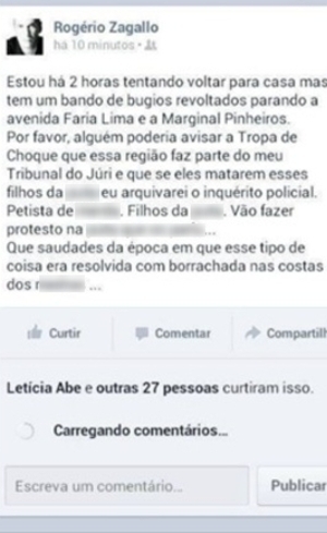 As críticas foram postadas na página pessoal de Zagallo no Facebook e eram dirigidas a manifestantes do Movimento Passe Livre, que obstruíram o acesso do promotor ao Clube Esporte Pinheiros, onde Zagallo tinha ido buscar o filho de 11 anos. "Estou há duas horas tentando voltar para casa, mas tem um bando de bugios revoltados parando a [avenida Brigadeiro] Faria Lima e a marginal Pinheiros. Por favor alguém pode avisar a Tropa de Choque que essa região faz parte do meu Tribunal do Júri e que se eles matarem esses filhos da p*** eu arquivarei o inquérito policial...Que saudades do tempo em que esse tipo de merda era resolvida com borrachada nas costas dos medras (sic)", escreveu Zagallo no perfil da rede social.