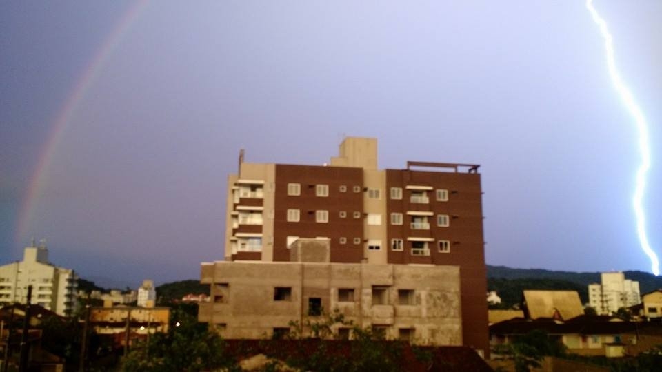 Um fenômeno meteorológico incomum foi registrado por uma moradora de Joinville, no Norte de Santa Catarina, na segunda-feira (12). Ela flagrou a ocorrência de arco-íris e de raio ao mesmo tempo. O fato ocorreu após uma chuva forte, próximo às 20h. Durante o período da tarde, a sensação de calor chegou a 51ºC na cidade.
