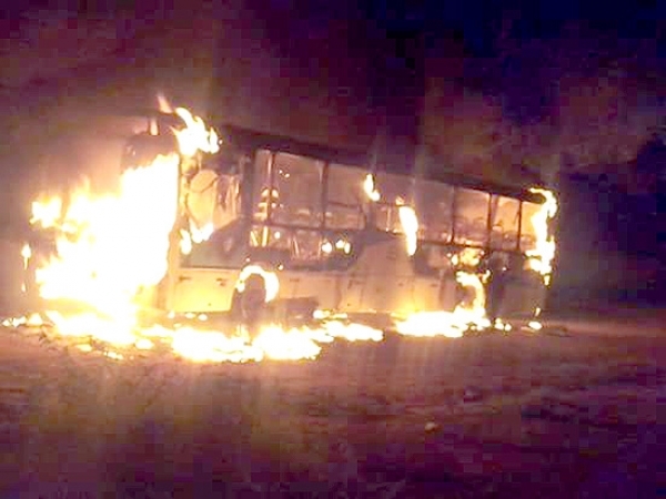 As chamas destruíram totalmente o ônibus da Norte Sul, no bairro Pedra 90, ontem à noite. A polícia apura a versão que três rapazes entraram, obrigaram alguns passageiros e o motorista a descer e atearam fogo, que rapidamente se alastrou. Não houve feridos.