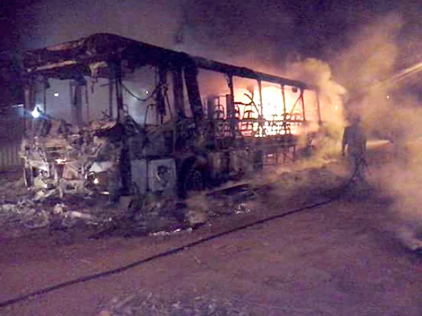 Os bombeiros apagaram o fogo e houve perda total no ônibus.