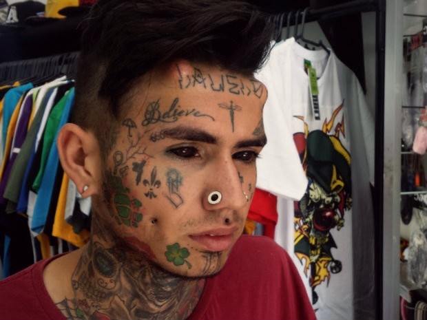 A primeira modificação corporal foi aos 11 anos, quando Bruno colocou o primeiro piercing, no nariz. Em seguida, vieram as tatuagens. As estrelas tatuadas em uma das coxas, aos 13, foi o primeiro contato que o jovem teve com a introdução de pigmentos por agulhas. “Hoje, sei que tenho pelo menos oito piercings. Quanto às tatuagens, já perdi as contas. No rosto, sei que são quase 20”, afirma.