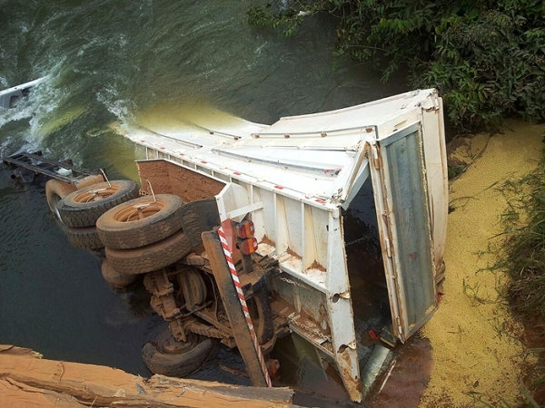 Bombeiros confirmaram, há pouco, que uma pessoa morreu e outra ficou ferida, no acidente com caminhão basculante que caiu de uma ponte, a cerca de 3 km da rodovia estadual MT-242 que liga Sorriso a Nova Ubiratã. O motorista conseguiu sair. Anildo Jubele Aguiar, de 38 anos, que estava na cabine, ficou preso nas ferragens e não resistiu.
