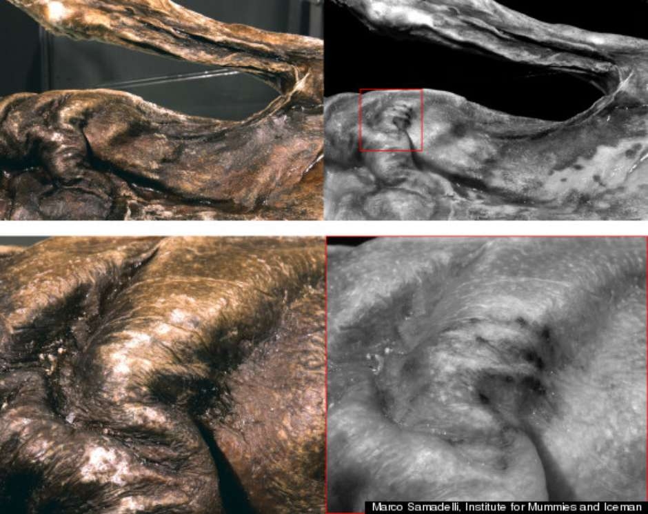 Pesquisadores italianos anunciaram nesta segunda-feira que descobriram uma tatuagem “estranha” na múmia conhecida por “Ötzi the Iceman” (Ötzi, o Homem do Gelo, em tradução livre), que possui 5.300 anos. As informações são do The Huffington Post.A análise da pele da múmia revelou a tatuagem escondida em camadas profundas da pele de cor escura de Ötzi. Segundo informaram, a tatuagem é composta por quatro linhas paralelas que medem de 20 a 25 milímetros. Os pesquisadores acreditam que foram feitas por incisões na qual um carvão foi esfregado na pele.