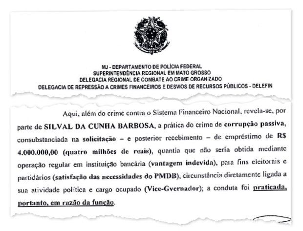 Antes mesmo da batida no apartamento do governador, os delegados foram peremptórios sobre a participação dele no esquema. “Além do crime contra o sistema financeiro nacional, revela-se por parte de Silval Barbosa a prática do crime de corrupção passiva, consubstanciada na solicitação – e posterior recebimento – de empréstimo de R$ 4 milhões (na campanha de 2008), quantia que não seria obtida mediante operação regular (vantagem indevida), para fins eleitorais e partidários (satisfação das necessidades do PMDB), circunstância ligada diretamente a sua atividade política e cargo ocupado (vice-governador); a conduta foi praticada, portanto, em razão da função”, escreveram os delegados ao STF.