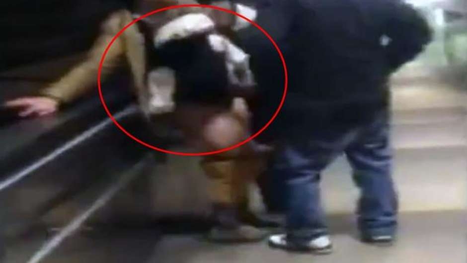 As imagens mostram a mulher com as calças abaixadas, segurando no corrimão da escadaria, enquanto o homem estava por trás. Os dois só se separam quando um passageiro chuta as pernas do homem, pedindo para que parassem.