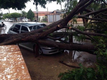 Uma parte de uma árvore caiu e danificou a frente de um VW Gol prata, esta tarde. O veículo estava estacionado na rua dos Cedros, no bairro Jardim Botânico, e a suspeita é de que ela, da espécie Sibipiruna, não tenha suportado um forte vento na região durante a chuva que caiu agora há pouco.