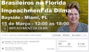 “Você brasileiro que mora no exterior, mas não está satisfeito com o governo brasileiro tem a obrigação de nos acompanhar neste ato de solidariedade aos protestos por todo o Brasil. Vamos nos reunir diante do Monumento Torch of Friendship em frente ao Bayside em downtown Miami. Domingo dia 15 de Março a partir das 12:00”, diz uma das convocações no Facebook.