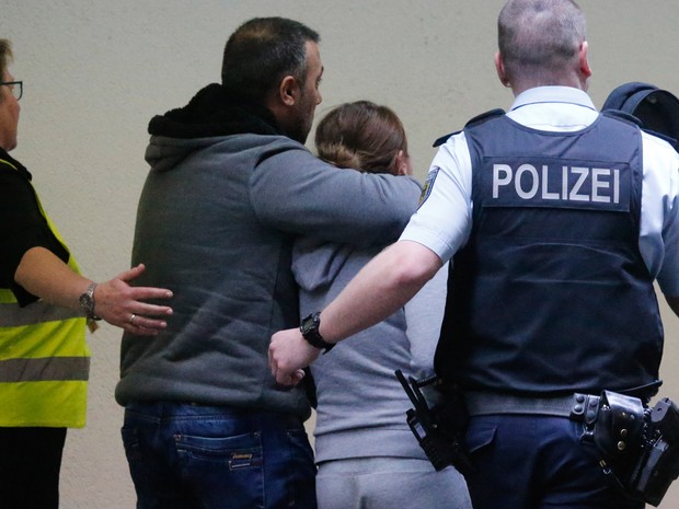 Um casal que aguardava o voo 4U9525 é escoltado por um policial e uma funcionária do aeroporto em Düsseldorf, na Alemanha (Foto: Frank Augstein/AP)